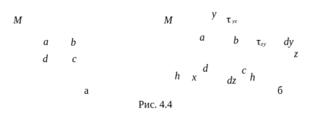 Из закрученной трубки (рис. 4.4а) у ее поверхности двумя поперечными сечениями и двумя осевыми сечениями выделим элемент abcd (рис. 4.4б) и рассмотрим его равновесие.