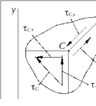 Отсутствие касательных напряжений в углах контура доказывается с помощью свойства парности касательных напряжений. На рис. 5.9 изображена угловая точка C. Докажем отсутствие касательных напряжений в точке C методом от противного. Предположим, что в точке C есть касательное напряжение tC. Разложим это напряжение на составляющие tCy и tCx, параллельные сторонам профиля. Тогда на основании закона парности касательных напряжений во взаимно перпендикулярных площадках (а это площадки, принадлежащие поверхности бруса) должны действовать такие же напряжения. Но поверхность бруса от напряжений свободна, значит, равны нулю составляющие tCy и tCx, а, следовательно, равно нулю и tC - касательное напряжение в угловой точке C.