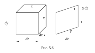 Условно закрепим левый торец элемента. На рис. 5.6 показана деформация элемента в этом случае. По отношению к выделенному элементу действующие по его граням касательные напряжения являются внешними силами, совершающими работу на соответствующих перемещениях. При статическом нагружении в упругой зоне потенциальная энергия деформации равна работе внешних сил. Значит, потенциальная энергия деформации dU, накопленная в вырезанном элементе, равна работе dW, совершенной касательными напряжениями, действующими по правой грани этого элемента:
