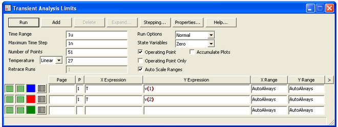После перехода в режим анализа во временной области и при отсутствии ошибок открывается окно задания параметров моделирования Transient Analysis Limits, показанное на рисунке 6.