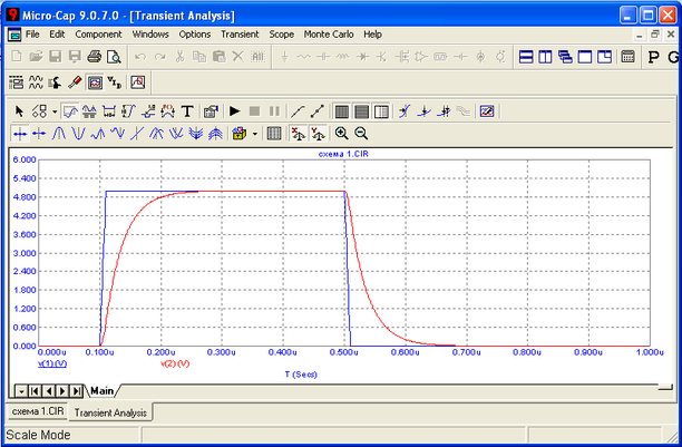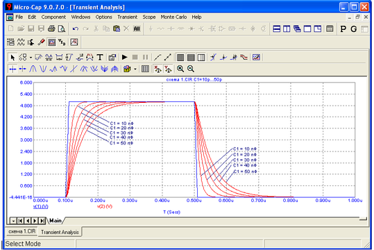 В качестве примера проведем моделирование RC-цепочки, показанной на рисунке 5. Зададим параметры моделирования, как показано на рисунке 6. После запуска моделирования получим графики, показанные на рисунке 7.