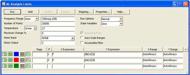Y Expresion – математическое выражение для переменной, откладываемой по оси Y. Это может быть коэффициент усиления в линейном масштабе v(6) или в логарифмическом масштабе db(v(6)), фаза в градусах ph(v(6));