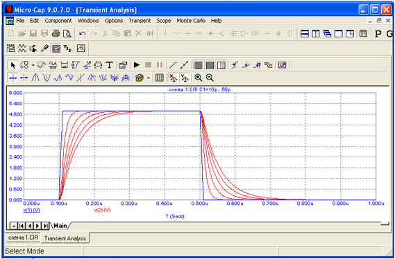 По сути, напряжение V(2) есть выходное напряжение цепи при отсутствии нагрузки. Тем самым, мы получили отклик цепи на входное воздействие в виде ступенчатой функции.