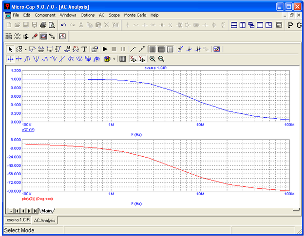 В режиме моделирования AC Analysis можно определить амплитудно-частотную (АЧХ) и фазо-частотную характеристику (ФЧХ) электронного устройства. Ко входу схемы должен быть подключен источник синусоидального или импульсного сигнала. При расчете частотных характеристик комплексная амплитуда этого источника сигнала полагается равной 1 В, начальная фаза нулевая, а частота меняется в пределах, задаваемых в меню AC Analysis Limits.