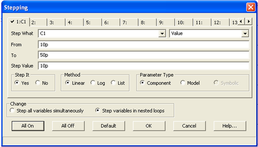 В системе моделирования MicroCAP 9 есть полезная возможность проведения многовариантного анализа при вариации любого параметра компонента схемы или его модели. Для этого в окне задания параметров нажатием на панель Stepping открывают окно для задания варьируемых параметров. В этом окне в строке Step What указывают имя варьируемого параметра, в последующих строках задаются пределы изменения параметра и шаг его изменения. Затем нажимают кнопку All On (рисунок 8).