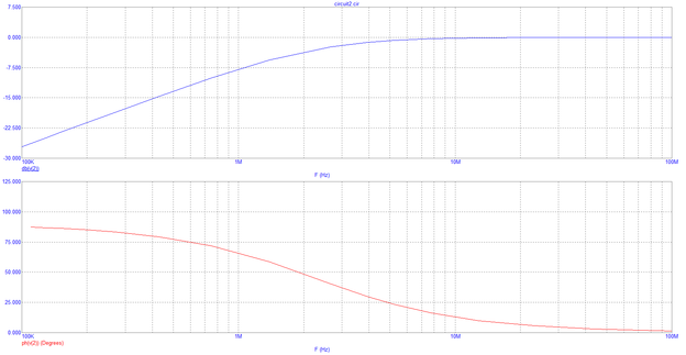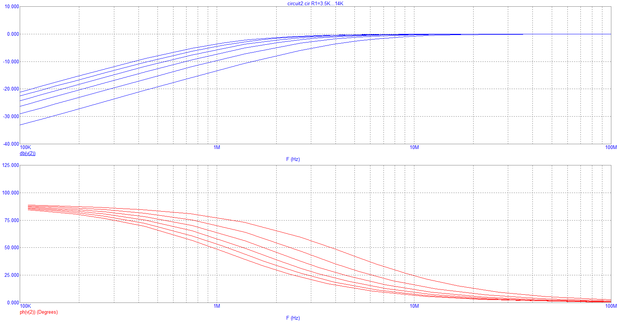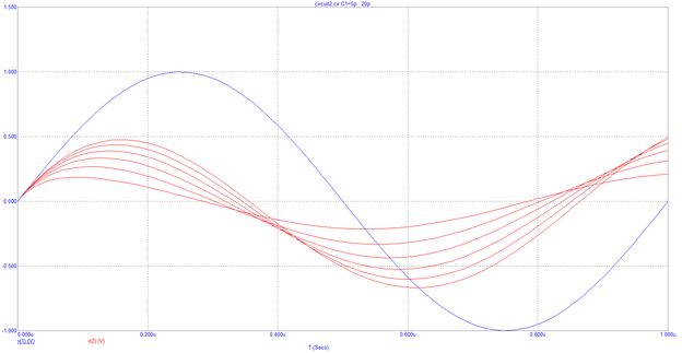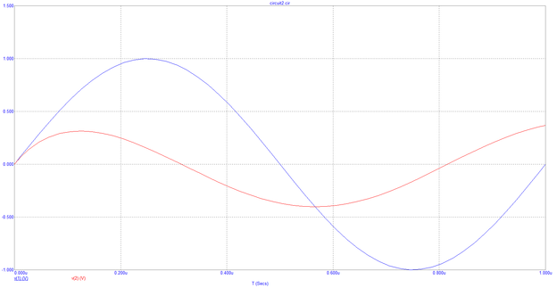 По графику отклика видим, что схема влияет на сигнал таким образом, что выходной сигнал имеет меньшую амплитуду и отстает по фазе