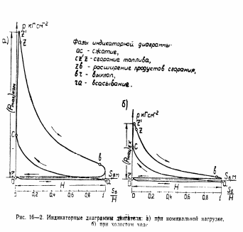 Различают два режима работы двигателя: 1) при холостом ходе, когда муфта сцепления отключена и коленчатый вал 1 отключен от остальных механизмов двигателя и 2) при номинальной нагрузке (во время движения мотоцикла), когда муфта соединяет коленчатый вал 1 с остальными двигателями мотоцикла. Индикаторные диаграммы для левого и правого цилиндра при номинальной нагрузке и холостом ходе представлены на рисунке 2, данные для их построения – 2а и 2б