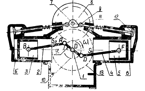 Двигатель мотоцикла является четырехтактным двухцилиндровым двигателем внутреннего сгорания. Схема механизмов представлена на рисунке 1. Основным механизмом в двигателе является кривошипно- ползунный механизм. Коленчатый вал 1 с маховиком 13 расположен параллельно продольной оси мотоцикла. Коленчатый вал соединен с остальными механизмами муфтой сцепления. В зависимости от расположения муфты сцепления коленчатый вал может быть соединен с остальными двигателями мотоцикла или полностью отключен от них. С кривошипами OA и OD, расположенными под углом 180°, соединены шатуны 2 и 4. При таком положении поршни 3 и 5 двигаются в противоположных направлениях. Рабочий цикл в каждом цикле двигателя совершается за два оборота коленчатого вала. Чередование процессов, протекающих в левом и правом цилиндре 6 и 6’, происходит следующим образом: