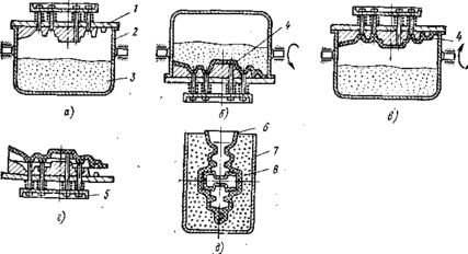 Оболочковые формы (разъемные, тонкостенные), изготовляют следующим образом: металлическую модельную плиту 1, нагретую до температуры 200—250 °С, закрепляют на опрокидывающем бункере 2 (рис. 1, а) с формовочной смесью 3 и поворачивают его на 180° (рис. 1, б). Формовочная смесь, состоящая из мелкозернистого кварцевого песка (93—96 %) и термореактивной смолы ПК-104 (4—7 %), насыпается на модельную плиту и выдерживается 10—30 с. От теплоты модельной плиты термореактивная смола в пограничном слое переходит в жидкое состояние, склеивает песчинки с образованием песчано-смоляной оболочки 4 толщиной 5—20 мм в зависимости от времени выдержки. Бункер возвращается в исходное положение (рис. 1, в), излишки формовочной смеси ссыпаются на дно бункера, а модельная плита с полутвердой оболочкой 4 снимается с бункера и нагревается в печи при температуре 300—350 °С в течение 1—1,5 мин, при этом термореактивная смола переходит в твердое необратимое состояние. Твердая оболочка снимается с модели специальными толкателями 5 (рис. 1, г). Аналогично изготовляют и вторую полуформу.