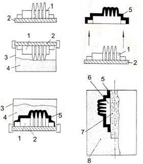 Формы изготавливают многократным погружением модельного блока 3в специальную жидкую огнеупорную смесь5, налитую в емкость4(рис.6.2.г) с последующей обсыпкой кварцевым песком. Затем модельные блоки сушат на воздухе или в среде аммиака. Обычно наносят 3…5 слоев огнеупорного покрытия с последующей сушкой каждого слоя.