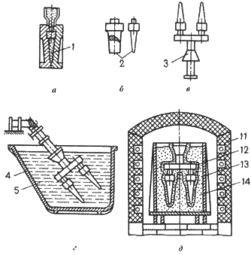 Модели из форм удаляют, погружая в горячую воду или с помощью нагретого пара. После удаления модельного состава тонкостенные литейные формы устанавливаются в опоке, засыпаются кварцевым песком, а затем прокаливают в печи в течение 6…8 часов при температуре 850…950 0C для удаления остатков модельного состава, испарения воды (рис. 6.2.д)