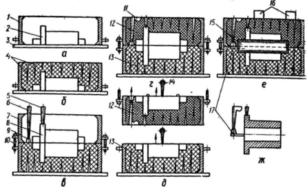 стержневые знаки стержень 15; нижнюю полуформу накрывают верхней и нагружают грузами 16(е);