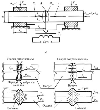 68) Схема контактной стыковой сварки сопротивлением. Вид сварного соединения, техн.возможности.
