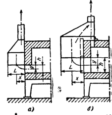Рис. 5.2. Схемы зонтов у нагревательных печей: а – у щелевого отверстия при выпуске через него продуктов горения; б – у отверстия, снабженного дверкой, при выпуске продуктов горения через газовые окна.