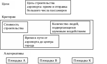 Предположим, что комиссия по выбору места постройки аэропорта предварительно отобрала из нескольких возможных три варианта: А, В, К. Тогда структура решаемой задачи может быть представлена в виде, показанном на рис. 5.