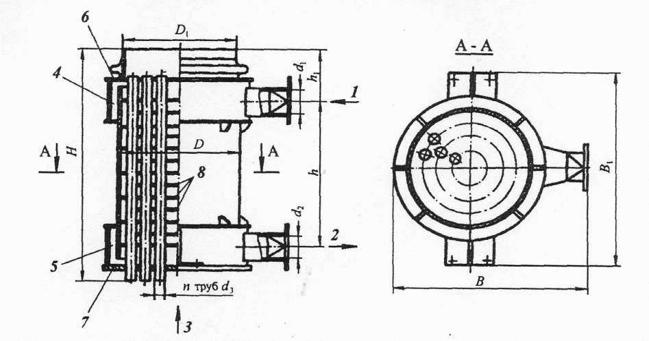 Рис. Кожухотрубный рекуператор: 1- подвод холодного воздуха; 2- отвод горячего воздуха; 3- подвод газа; 4- коллектор холодного воздуха; 5- коллектор горячего воздуха; 6- верхняя трубная доска; 7- нижняя трубная доска; 8 - перегородки