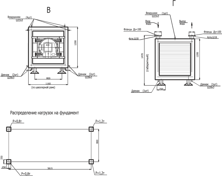Котел самонесущий, имеет 8 опор, приваренных к вертикально расположенным коллекторам блоков. При поставке единым блоком опорами котел опирается на раму, изготовленную из швеллера №20. При поставке двумя блоками - топочным и конвективным - на бетонные стойки. При варианте котла на раме устройство специального фундамента не требуется.