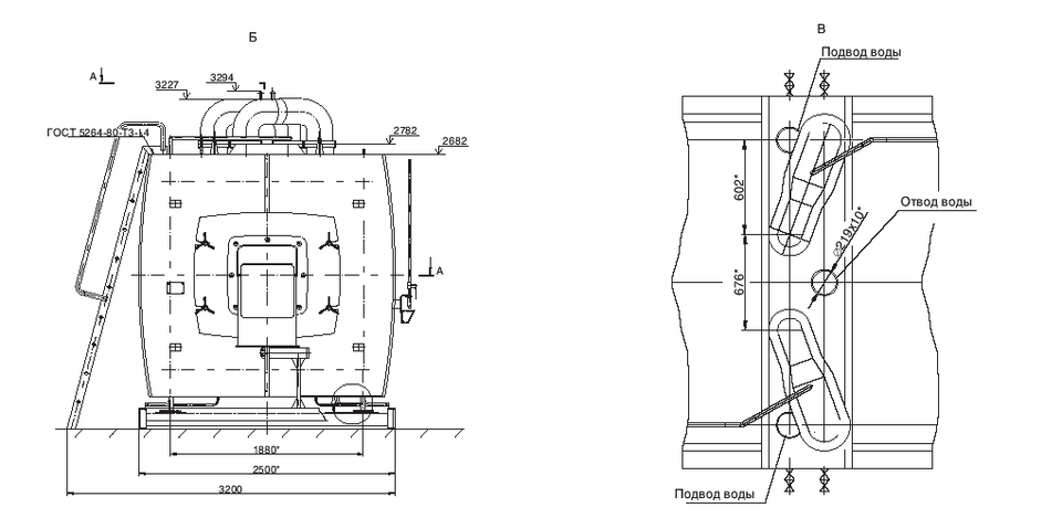 Конвективная поверхность нагрева, находящаяся следом за топочной камерой, состоит из U-образных ширм Ø32х3 с шагом S1=80мм и S2=33мм. Боковые стены конвективного газохода закрыты горизонтально расположенными трубами (стояками) Ø60x3мм и ввариваются в вертикальные коллектора Ø219x10мм. Газоплотность боковых стенок конвективной части обеспечивается путем приварки уголка 32x32x4. Доступ к конвективным поверхностям обеспечивается за счёт расположенного над конвективной камерой прямоугольного лаза 400x450мм и лаза в коробе газовом. Циркуляция воды в котле принудительная. воды в котле принудительная. Подвод воды для котла осуществляется в коллектор конвективной части, отвод воды – из коллектора топочного блока.