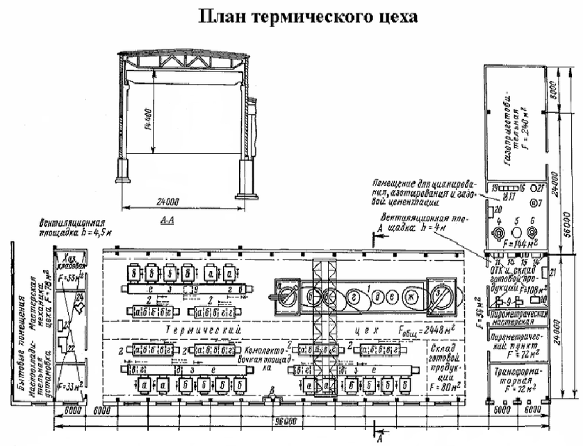 3 | а—электрокамерная печь для нагрева деталей под закалку; б—камерная электропечь для отпуска; в—масляной передвигающийся закалочный бак с опускающейся и поднимающейся платформой: г— водяной передвигающийся закалочный бак с подвижной платформой (вверх вниз): д—моечная машина; е—механизированный конвейер в герметически закрытой камере; |