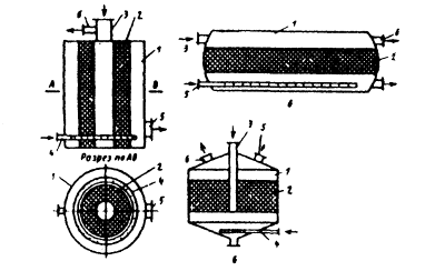 Фильтрация очищаемых выбросов происходит через неподвижный (адсорберы периодического действия) или движущийся слой твердого поглотителя - адсорбента (адсорберы непрерывного действия). Наиболее распространены адсорберы периодического действия, в которых период контактирования очищаемого газа с адсорбентом чередуется с периодом его регенерации. Конструктивно адсорберы (рис. 3.2.) выполняются в виде вертикальных, горизонтальных либо кольцевых емкостей, заполненных пористым адсорбентом. Выбор конструкции определяется скоростью газовой смеси, размером частиц адсорбента, требуемой степенью очисткии рядом других факторов.