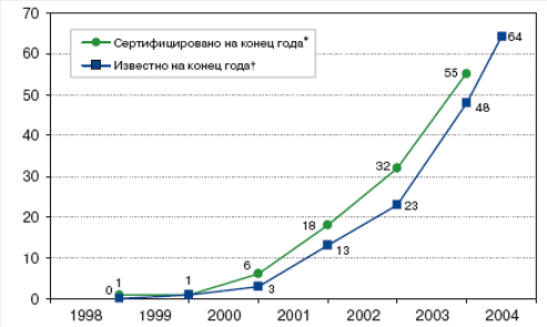 * Число организаций, имеющих действующие сертификаты на 31 декабря соответствующего года, по данным Общественного регистра сертификации на момент публикации (30 июня 2004 г.).