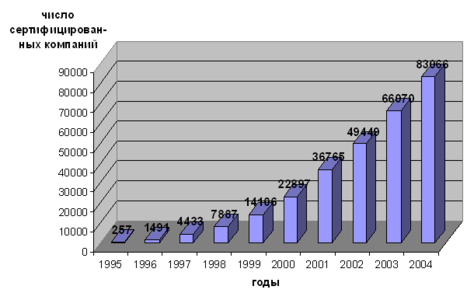 Рис. 4. Динамика числа компаний, сертифицированных по ISO 14001 с 1995 по конец 2004 года по всему миру.