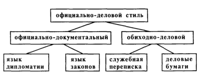 Официально-деловой стиль подразделяется на две разновидности, два подстиля — официально-документальный и обиходно-деловой. В первом можно выделить язык дипломатии (дипломатические акты) и язык законов, а во втором — служебную переписку и деловые бумаги. Схематически это можно представить следующим образом: