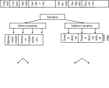 Терминологическое значение гиперонима высшего уровня taxation (налогообложение) определяется как «сбор, взимаемый центральным правительством с физических лиц или корпорятивных организации в форме налога на доход или прибавке к цене. В первом случае мы имеем дело с прямым налогообложением, во втором – с косвенным». В приводимой дефиниции довольно четко прослеживается признак «форма, способ налогообложения», на основе которого модно провести деление родового понятия taxation на видовые понятия direct taxation (прямое налогообложение) и indirect taxation (косвенное налогообложение), которые конституируют первый уровень ПТ. Для второго уровня понятийного общения термины direct taxation и indirect taxation являются родовыми по отношению к своим разновидностям: income tax (подоходный налог), corporation tax (налог с корпораций), wealth tax (налог на имущество) и т.д. Для гипонимов третьего уровня иерархической структуры advance corporation tax, mainstream corporation tax, stamp duty on bill of exchange, stamp duty on securities гиперонимами являются гипонимы второго уровня corporation tax и stamp duty соответственно.