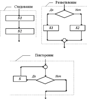 Основными конструкциями структурного программирования являются: следование, разветвление и повторение. Компонентами этих конструкций являются обобщенные операторы S, S1, S2 и условие P. В качестве обобщенного оператора может быть либо простой оператор используемого языка программирования (операторы присваивания, ввода, вывода, обращения к процедуре), либо фрагмент программы, являющийся композицией основных управляющих конструкций структурного программирования. Существенно, что каждая из этих конструкций имеет по управлению только один вход и один выход. Тем самым, и обобщенный оператор имеет только один вход и один выход.