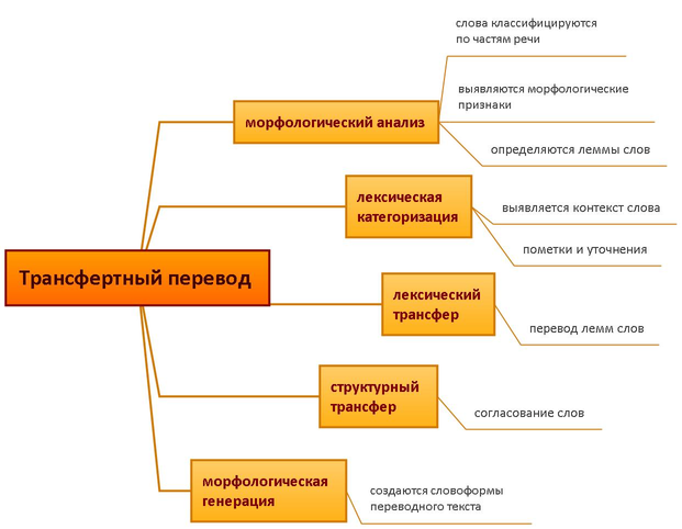 При использовании этой стратегии получается достаточно высокое качество переводов, с точностью в районе 90% (хотя это сильно зависит от языковой пары). Работа любой системы трансфертного перевода состоит как минимум из пяти частей: