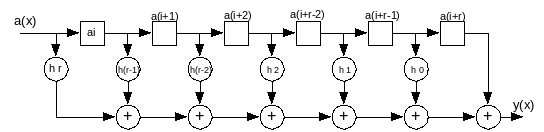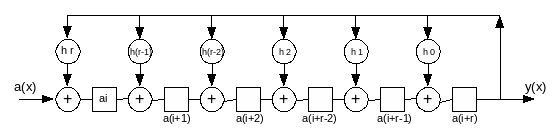 Линейными переключательными схемами с конечным числом состояний называются любые схемы, содержащие конечное число сумматоров, устройств памяти и устройств умножения на константу, соединенных любым допустимым способом. Вход и выход предполагаются последовательными, т.е. входной сигнал состоит из элементов поля, подаваемых на вход последовательно – по одному в единицу времени.