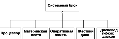 В качестве примера отношения агрегации можно рассмотреть взаимосвязь типа "часть-целое", которая имеет место между классом Системный блок персонального компьютера и его составными частями: Процессор, Материнская плата, Оперативная память, Жесткий диск и Дисковод гибких дисков. Используя обозначения языка UML, компонентный состав системного блока можно представить в виде соответствующей диаграммы классов (рис. 6.10), которая в данном случае иллюстрирует отношение агрегации.