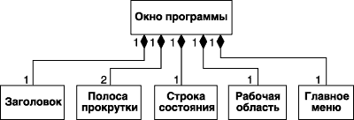 Для отношений композиции и агрегации могут использоваться дополнительные обозначения, применяемые для отношения ассоциации. А именно, могут указываться кратности отдельных классов, которые в общем случае не обязательны. Применительно к описанному выше примеру класс Окно программы является классом-композитом, а взаимосвязи составляющих его частей могут быть изображены следующей диаграммой классов (рис. 6.12).