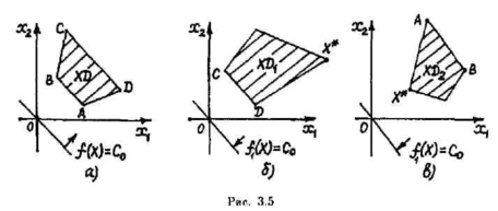 На рис. 3.5 представлены примеры таких областей и решений ЗЛП при п = 2. В случае области XD, изображенной на рис. 3.5, а, минимум достигается на множестве решений, являющихся точками отрезка АВ, а максимум — отрезка CD. Отрезки АВ и CD параллельны линиям постоянного уровня функций f(X)= с0 и f 1(Х)=с0. Для области XD1, показанной на рис. 3.5, б, минимум при решении ЗЛП достигается в точке X*, а максимум — на множестве точек отрезка CD. В случае области XD2 на рис. 3.5, в максимум достигается в точке X* , а минимум — на множестве точек отрезка АВ.