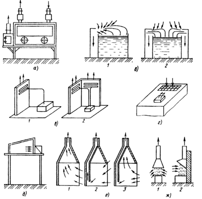 а – укрытие-бокс; б – бортовые отсосы (1–однобортовой; 2 –двухбортовой); в –боковые отсосы (1–односторонний; 2–угловой); г–отсос от рабочих столов; д–отсос витражного типа; е –вытяжные шкафы (1–с верхним отсосом; 2–с нижним отсосом; 3–с комбинированным отсосом); ж–вытяжные зонты (1–прямой; 2–наклонный).