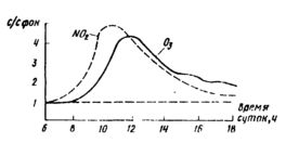 Для образования смога в атмосфере в солнечную погоду необходимо наличие оксидов азота, углеводородов (их выбрасывают в атмосферу автотранспорт, промышленные предприятия). Характерное распределение фотохимического смога по времени суток показано на рис. 2.1, а его воздействие на человека и растительность в табл. 2.5.