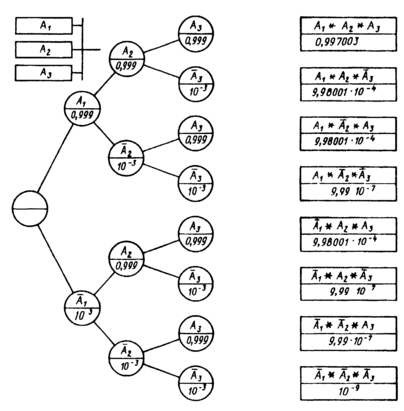 Во многих случаях представление о состоянии системы, альтернативных путях протекания и результатах какого-либо процесса можно создать с помощью более простого графа. Рассмотрим его построение на примере трех параллельно работающих компонентов А1, А2, и А3 (рис. 4.11). Исходным пунктом является кружок, который представляет в общем виде рассматриваемое состояние. Из этого узла ветви ведут к узлам, представляющим состояние первого компонента (в соответствии с заданными вероятностями), и таким же образом дальше от каждого из этих узлов к следующим, в которых указаны состояния второго и третьего компонентов, пока на выходе не получаются все возможные комбинации событий. В результате получается дерево событий, в котором каждый путь от исходной точки до конечного узла описывает одну из эволюции системы. В прямоугольниках справа от конечных узлов на рис. 4.11 еще раз указан результат события, соответствующий пути к этому конечному узлу. В рассматриваемом примере с тремя параллельно работающими компонентами в прямоугольниках указаны результирующие вероятности для состояния системы, которые при независимости выхода из строя отдельных компонентов получаются простым перемножением отдельных вероятностей (вероятность чепе в рассматриваемый отрезок времени принята одинаковой для каждого из трех компонентов: qi= 10-3; i== 1, 2, 3).
