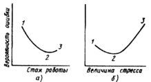 | Рис. 4.14. Схема взаимодействия химических веществ (пример) | 4.15 Характер изменения вероятности ошибки оператора в зависимости от: а – стажа работы (1 – начальный период; 2–оптимальная работа; 3– работа с большим стажем), б–величины стресса (1–малый стресс, 2– оптимальный стресс, 3–большой стресс) |