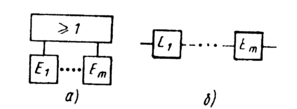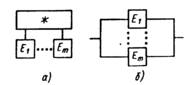 | Рис. 4.19. Описание опасности с помощью «зарядов»: Е1 – взрыв ресивера; e2 – обрыв троса; Ез – замыкание на корпус | Рис. 4.20. Символическое изображение подсистемы ИЛИ: а – графический символ; б – развернутая схема |