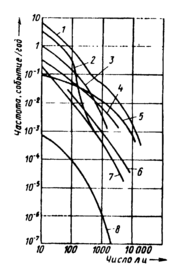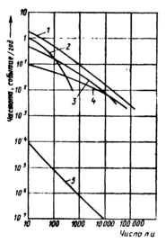 | Рис. 4.25. Частота и число связанных с техникой несчастных случаев: 1 – суммарная кривая; 2 – общее число аварий самолетов; 3–пожары; 4–взрывы; 5–прорывы плотин; 6–выбросы вредных химических веществ; 7– аварии самолетов (без пассажиров); 8– 100 атомных реакторов | Рис. 4.26. Частота и число природных катастрофических событий: 1–суммарная кривая; 2–-смерчи; 3– ураганы; 4–землетрясения; 5–падение метеоритов |