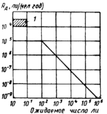 Однако это неравенство нуждается в корректировке, когда последствия чепе могут быть весьма значительными. Как следует из рис. 4.25 (кривая I), имеет смысл считать приемлемым критерием максимального числа летальных исходов в год значение Nо = 100. Если при определенных условиях можно ожидать число летальных исходов N > No, то значение допустимого риска следует уменьшить пропорционально отношению No/N (рис. 4.29), так что условие безопасности будет иметь вид