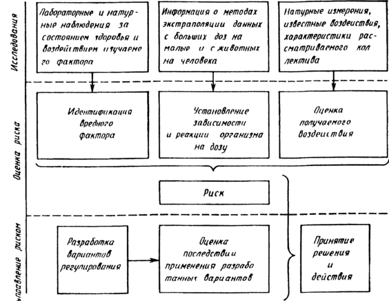Анализ риска, обусловленного наличием источника вредного действия, состоит из этапа оценки риска, сопровождаемого исследованиями, и этапа управления риском (рис. 4.31). На этапе оценки устанавливают, какие последствия вызывают разные дозы и в разных условиях в данном коллективе. На этапе управления риском анализируют разные альтернативы и выбирают наиболее подходящие управляющие воздействия. С целью принятия окончательного решения результаты оценки риска рассматривают с учетом инженерных, экономических и политических аспектов.
