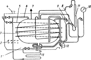5 – змеевик; 6 – дренажная труба; 7 – предохранительный клапан; 8 – вентиль; 9 – заправочный вентиль; 10–манометр; 11–указатель уровня; 12–вентиль для слива; 13–испаритель; 14– пробка для продувки отстойника