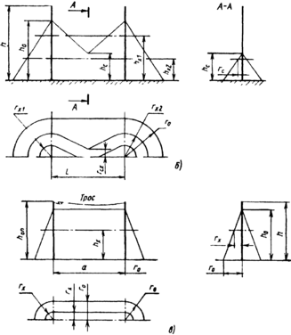 Для создания зон защиты применяют одиночный стержневой молниеотвод; двойной стержневой молниеотвод; многократный стержневой молниеотвод; одиночный или двойной тросовый молниеотвод. В качестве примера на рис. 5.13 приведена конфигурация и размеры зон защиты некоторых типов молниеотводов.