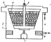 На рис. 6.20 представлена схема фильтра-сепаратора с фильтровальной загрузкой из частиц пенополиуретана, предназначенного для очистки сточных вод от маслопродуктов и твердых частиц. Сточную воду по трубопроводу 5 подают на нижнюю опорную решетку 4. Затем вода проходит через фильтровальную загрузку в роторе 2, верхнюю решетку 4 и очищенная от примесей переливается в приемный кольцевой карман 6 и выводится из корпуса 1. При концентрации маслопродуктов и твердых частиц до 0,1 кг/м3 эффективность очистки составляет соответственно 0,92 и 0,9; а время непрерывной эксплуатации фильтра 16...24 ч. Достоинствами данной конструкции являются простота и большая эффективность регенерации фильтра. При включении электродвигателя 7 вращается ротор 2 с фильтровальной загрузкой. В результате частицы пенополиуретана под действием центробежных сил отбрасываются к внутренним стенкам ротора, выжимая из него маслопродукты, которые поступают в карманы 3 и направляются на регенерацию. Время полной регенерации фильтра 0,1 ч.