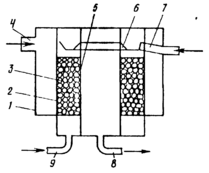 Для очистки больших расходов сточных вод от мелкодисперсных твердых примесей применяют зернистые фильтры (рис. 6.19). Сточная вода по трубопроводу 4 поступает в корпус 1 фильтра и проходит через фильтровальную загрузку 3 из частиц мраморной крошки, шунгизита и т. п., расположенную между пористыми перегородками 2 и 5. Очищенная от твердых частиц сточная вода скапливается в объеме, ограниченном пористой перегородкой 5, и выводится из фильтра через трубопровод 8. По мере осаждения твердых частиц в фильтровальном материале перепад давлений на фильтре увеличивается и при достижении предельного значения перекрывается входной трубопровод 4и по трубопроводу 9 подается сжатый воздух. Он вытесняет из фильтровального слоя 3 воду и твердые частицы в желоб 6, которые затем по трубопроводу 7 выводятся из фильтра. Достоинством конструкции фильтра является развитая поверхность фильтрования, а также простота конструкции и высокая эффективность.