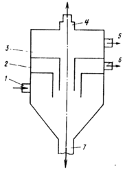 На рис. 6.18 представлена схема напорного гидроциклона, обеспечивающего очистку сточной воды и от твердых частиц, и от маслопродуктов. Сточная вода через установленный тангенциально по отношению к корпусу гидроциклона входной трубопровод 1 поступает в гидроциклон. Вследствие закручивания потока сточной воды твердые частицы отбрасываются к стенкам гидроциклона и стекают в шламосборник 7, откуда они периодически удаляются. Сточная вода с содержащимися в ней маслопродуктами движется вверх. При этом вследствие меньшей плотности маслопродуктов они концентрируются в ядре закрученного потока, который поступает в приемную камеру 3, и через трубопровод 5 маслопродукты выводятся из гидроциклона для последующей утилизации. Сточная вода, очищенная от твердых частиц и маслопродуктов, скапливается в камере 2, откуда через трубопровод 6 отводится для дальнейшей очистки. Трубопровод 4 с регулируемым проходным сечением предназначен для выпуска воздуха, концентрирующегося в ядре закрученного потока очищаемой сточной воды.