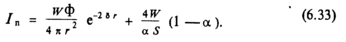 Интенсивность прямой волны в общем случае определяется формулой (6.28). Выразим плотность потока энергии Ig через мощность источника. При работе источника в изолированный объем постоянно поступает энергия. При мощности источника W отраженный от границ полный поток энергии составит pW, а от единичной площадки pW/S. За единицу времени через единичную площадку границы вследствие поглощения исчезнет количество энергии, равное αIg. Так как в диффузном поле плотность энергии постоянная, то должно соблюдаться равенство рW/S=αIg. Для простоты дальнейших рассуждений здесь предполагается, что коэффициент а значительно больше коэффициента т. Уравнение (6.32) принимает вид