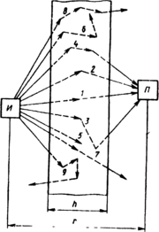 При прохождении излучением защитной среды приемник регистрирует (рис. 6.55) как непровзаимодействовавшие со средой излучение 1, так и однократно 2 и многократно 3 и 4 рассеянное излучение. Излучение 5...9 не достигает приемника: излучение 5, 6 из-за поглощения в среде, излучение 7, 8 из-за направления траектории за защитной средой не на приемник, а излучение 9 – вследствие отражения. В первом приближении расчет защиты можно произвести, учитывая только нерассеянное излучение. Мощность дозы излучения D при установке защитного экрана толщиной h (см. рис. 6.55) претерпевает изменение на расстоянии г по экспоненциальному закону:
