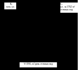 Капитальные (К) и эксплуатационные (С) затраты на процесс доочистки сточных вод адсорбцией на активированных углях в зависимости от объемного расхода V сточных вод представлены на рис. 3.2.1 кривыми 1.